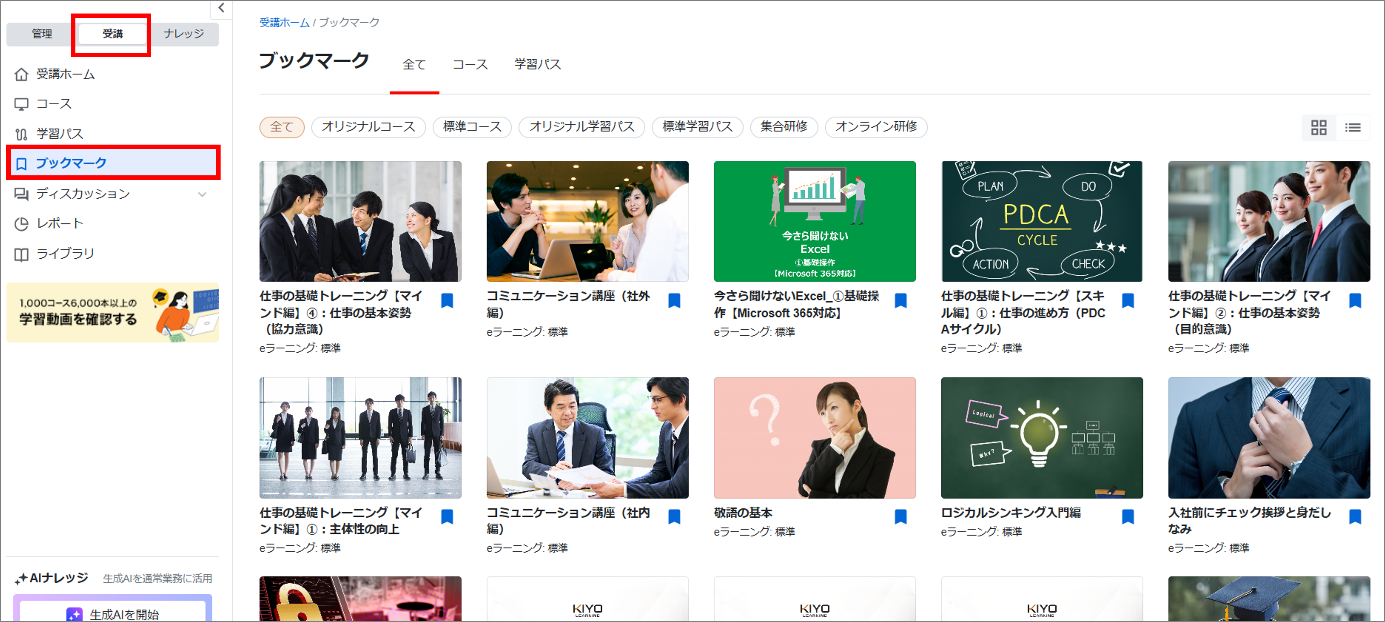 ブックマークしたコース・学習パスは受講モードから確認することができます。