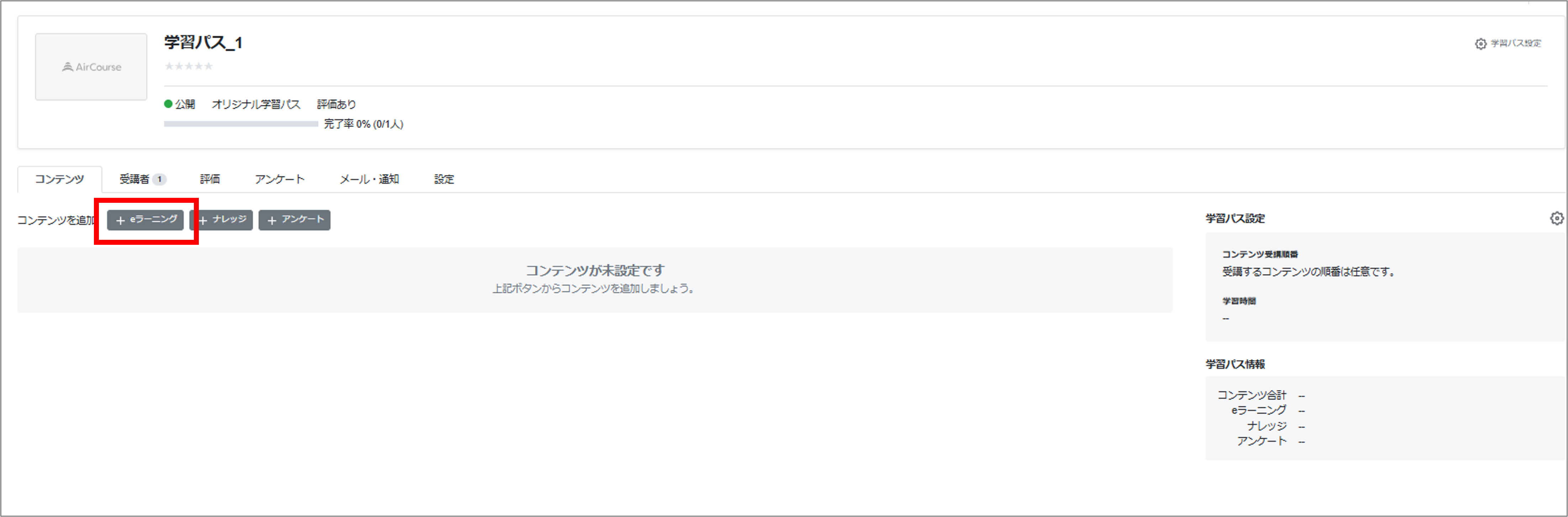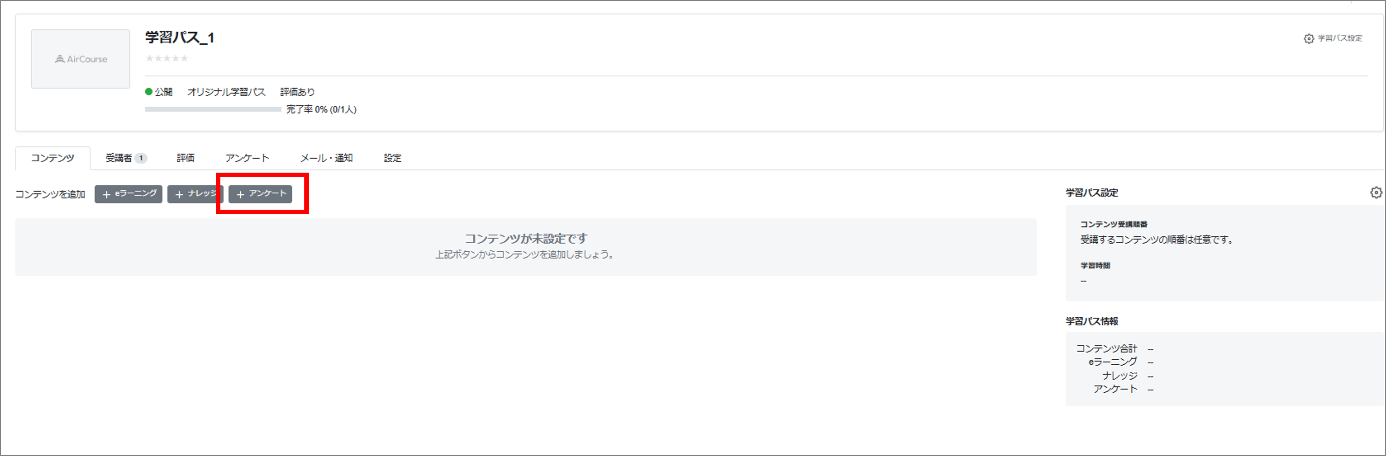 学習パスには、コース・アンケート・ナレッジの3種類のコンテンツを合計最大300件まで登録できます。