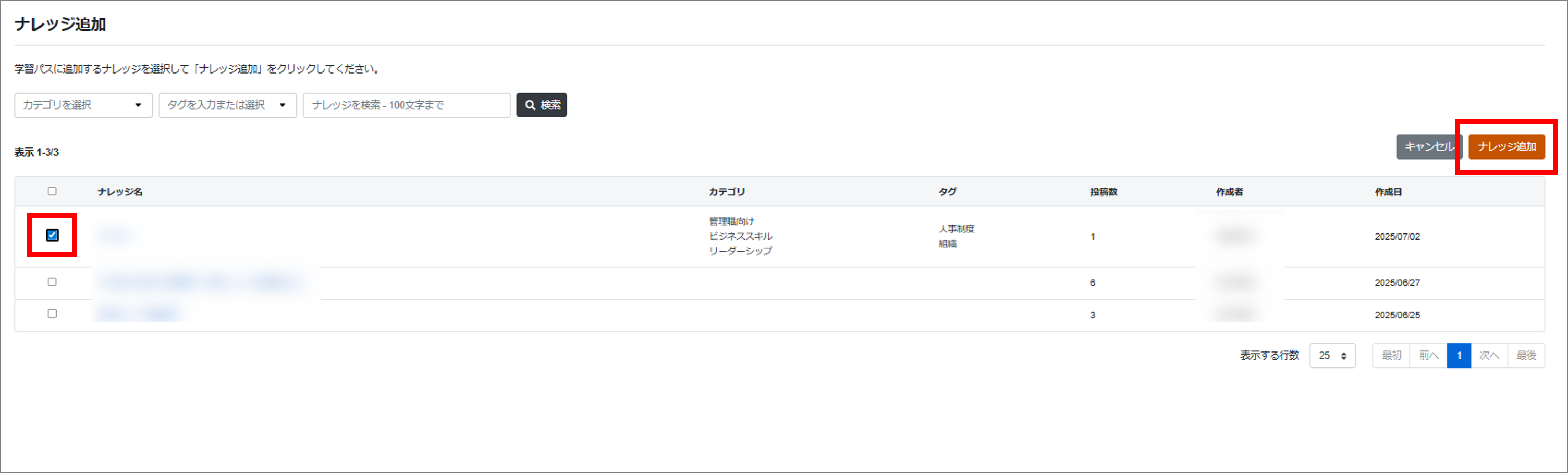 学習パスに追加したいナレッジにチェックを入れ、「ナレッジ追加」をクリックします。