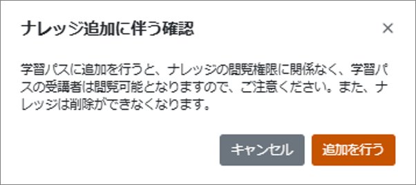 学習パスに追加されたナレッジは、元々のナレッジの閲覧権限に関係なく、その学習パスの受講者は閲覧可能となりますのでご注意ください。また、学習パスに登録されたナレッジは、削除ができなくなります。削除する場合には、学習パスに追加されたナレッジを除外してから削除してください。
