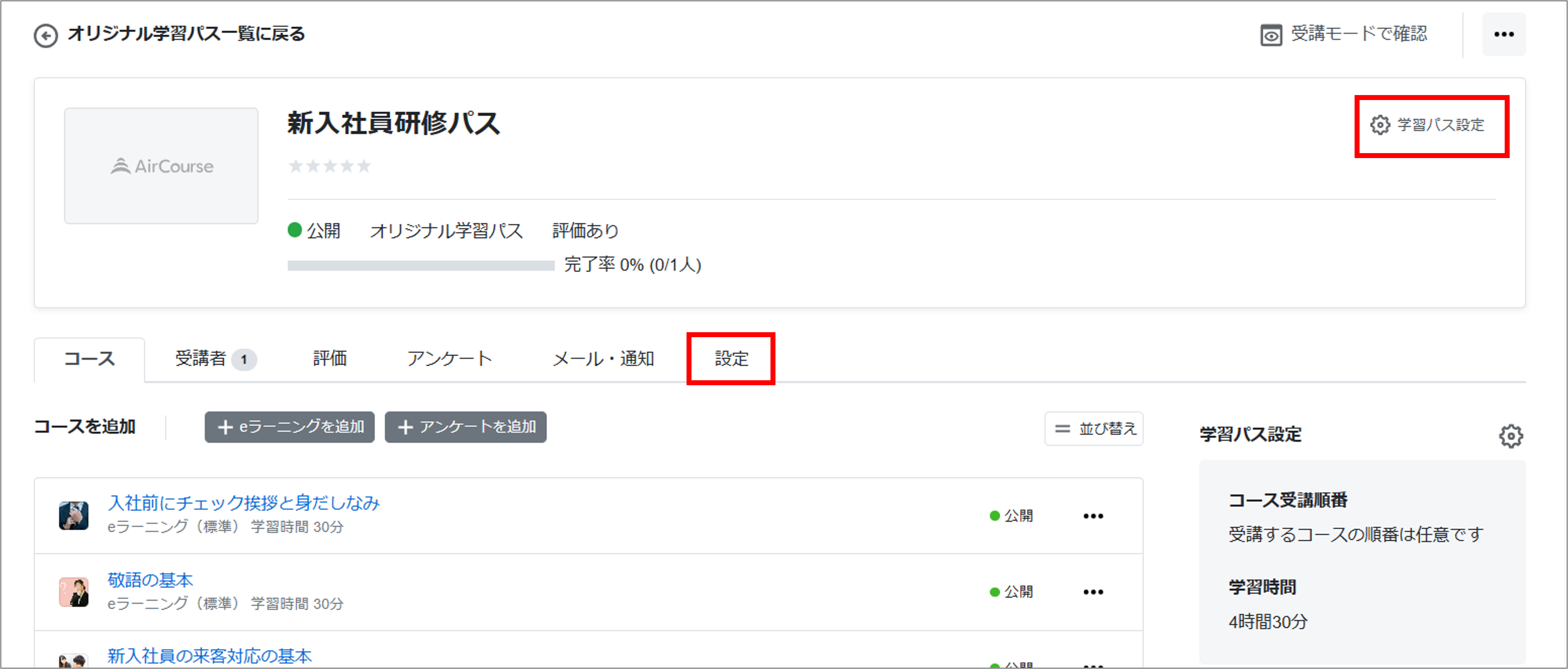 学習パス設定では「受講期間」や「受講設定」、「学習時間(分)」の設定ができます。「学習パス設定」または「設定」タブをクリックします。