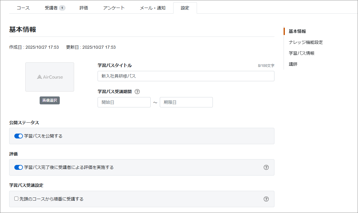 学習パス設定では、受講設定や学習時間の設定が可能です。