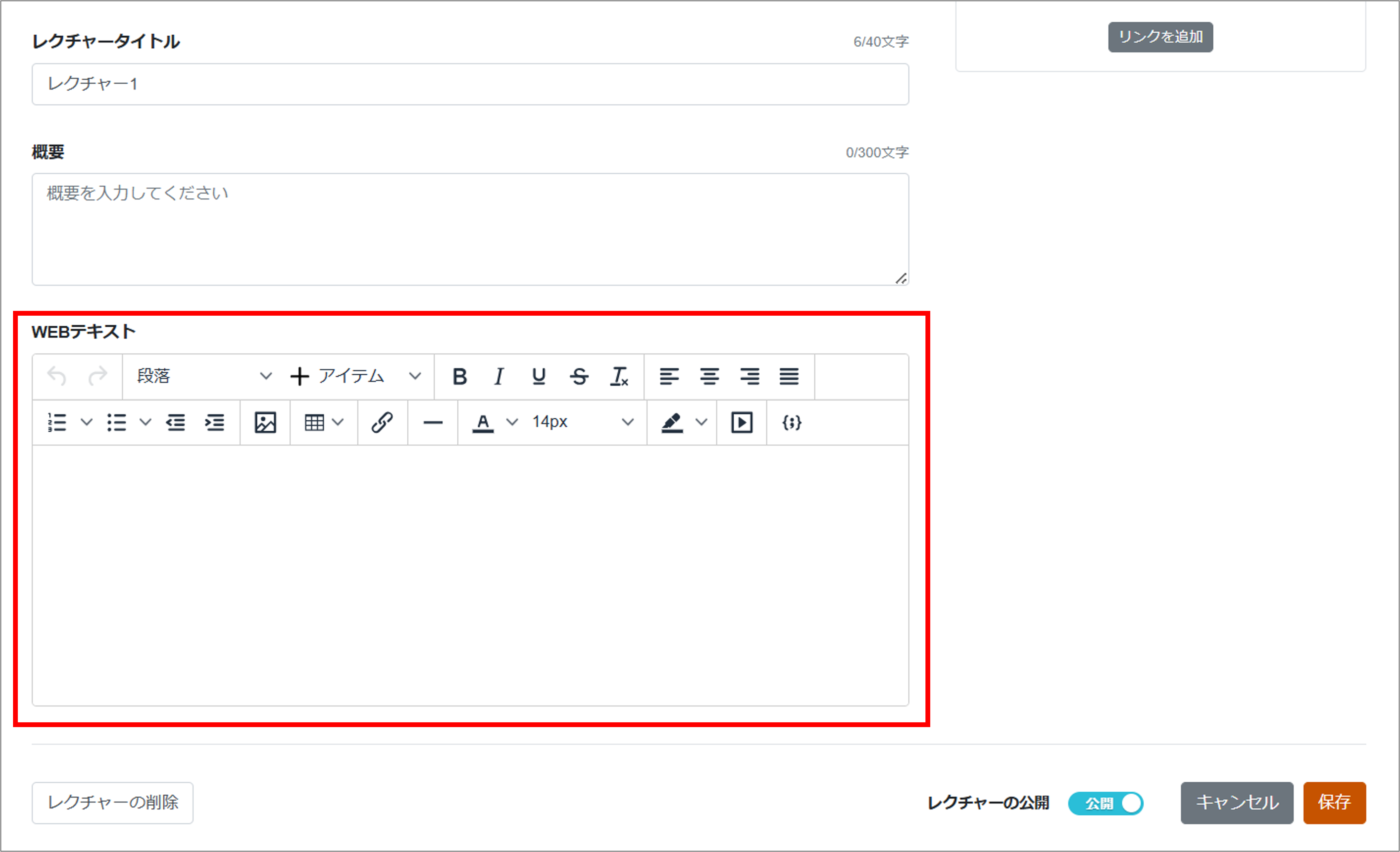 そうすると、以下のようなレクチャーの編集画面が表示され、動画、テキスト、資料が登録できるようになります。