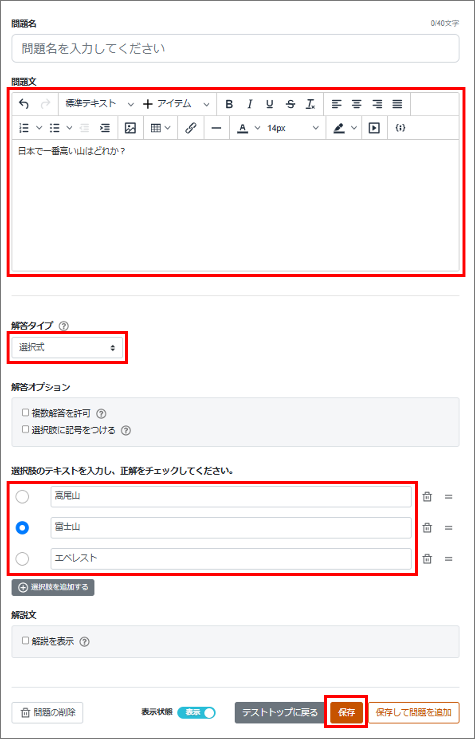 問題文のところに、問題の文章を入力します。(例:日本一高い山はどれか?)