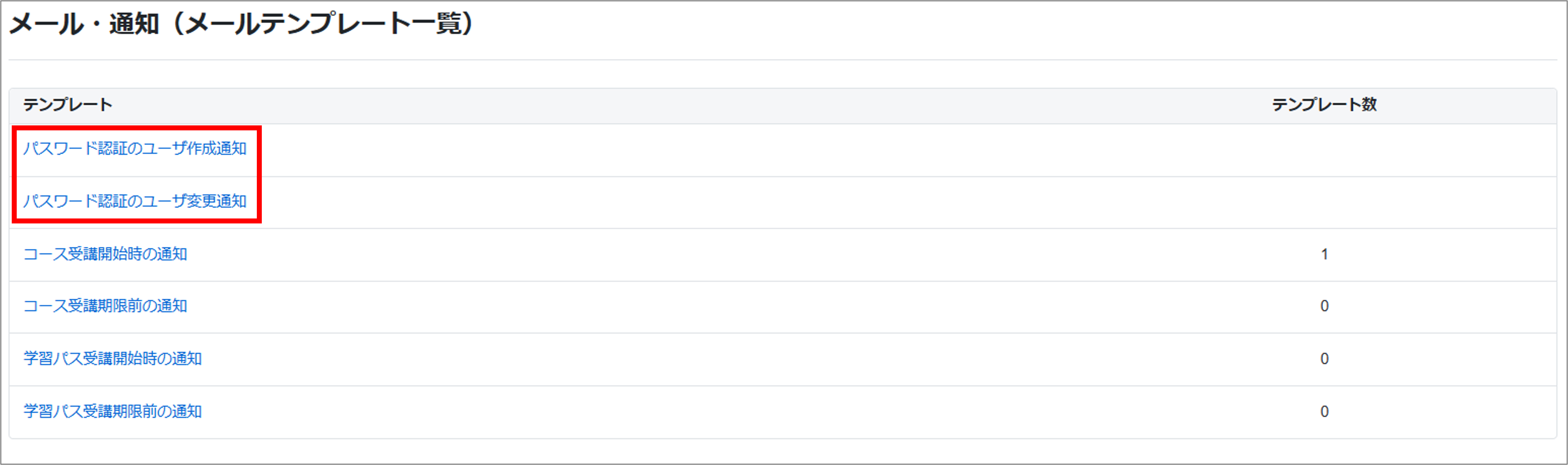 パスワード認証のユーザ作成通知とパスワード認証のユーザ変更通知は、こちらの画面で件名や通知文面を編集することが可能です。