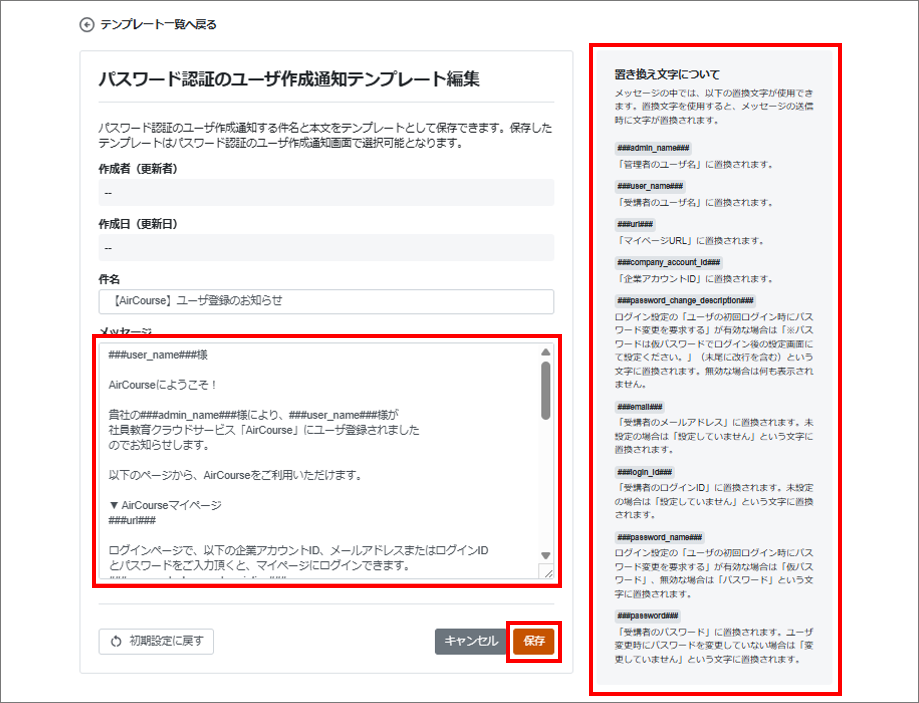 全体管理者はパスワード認証のユーザ作成通知・パスワード認証のユーザ変更通知を編集することができます。