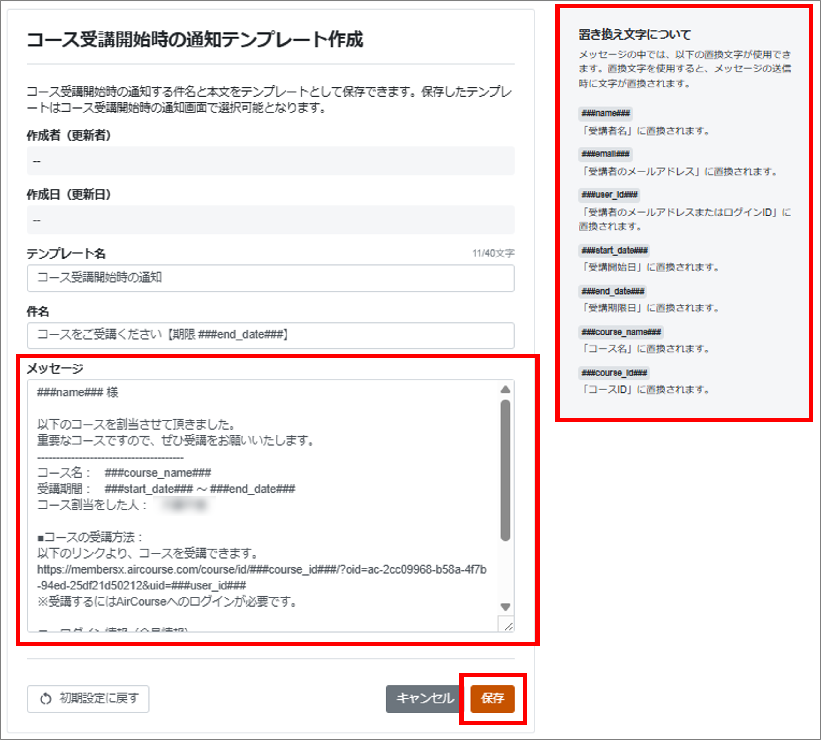 「通知内容」を編集します。テンプレートが入っていますが、編集することができます。