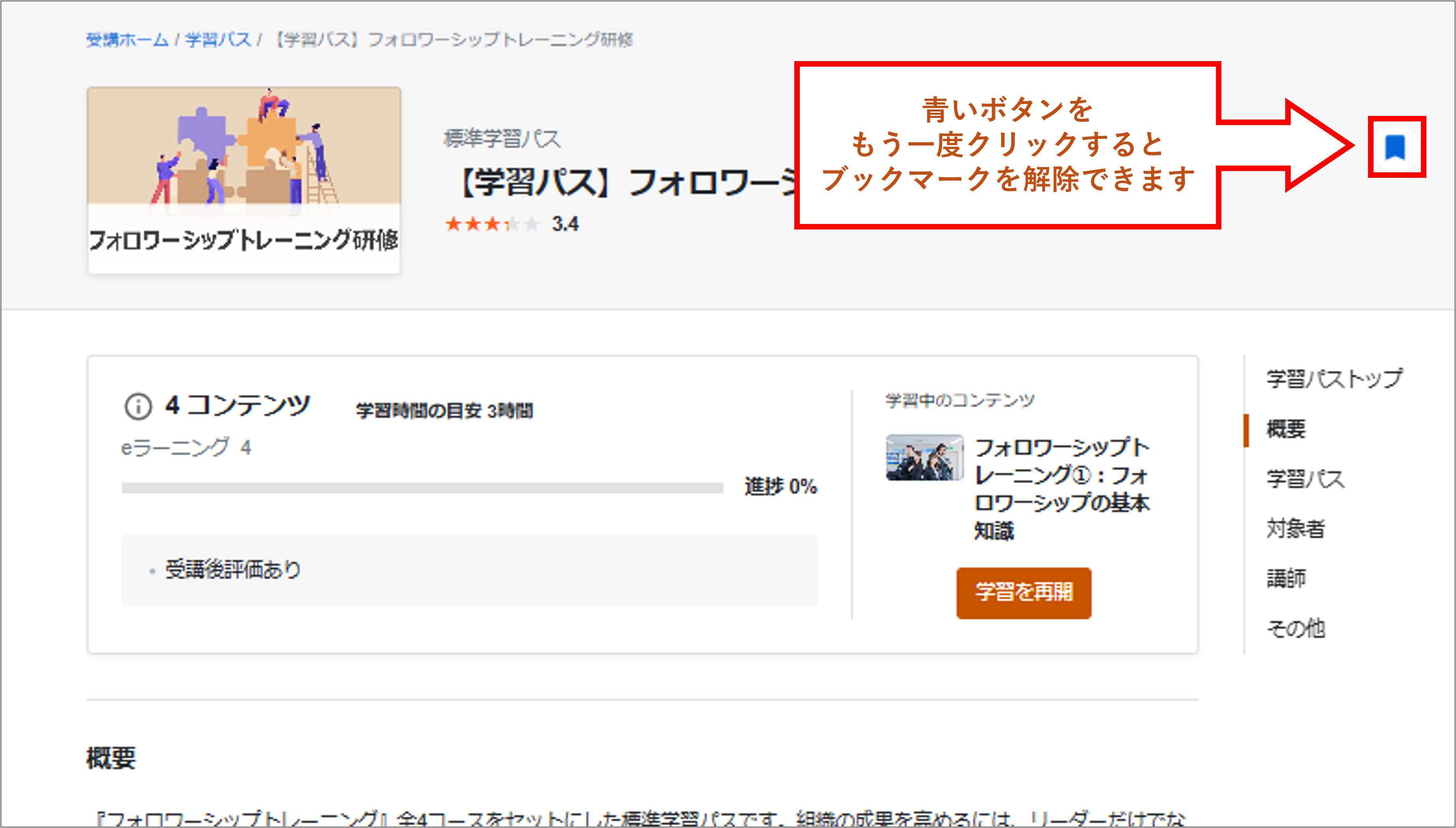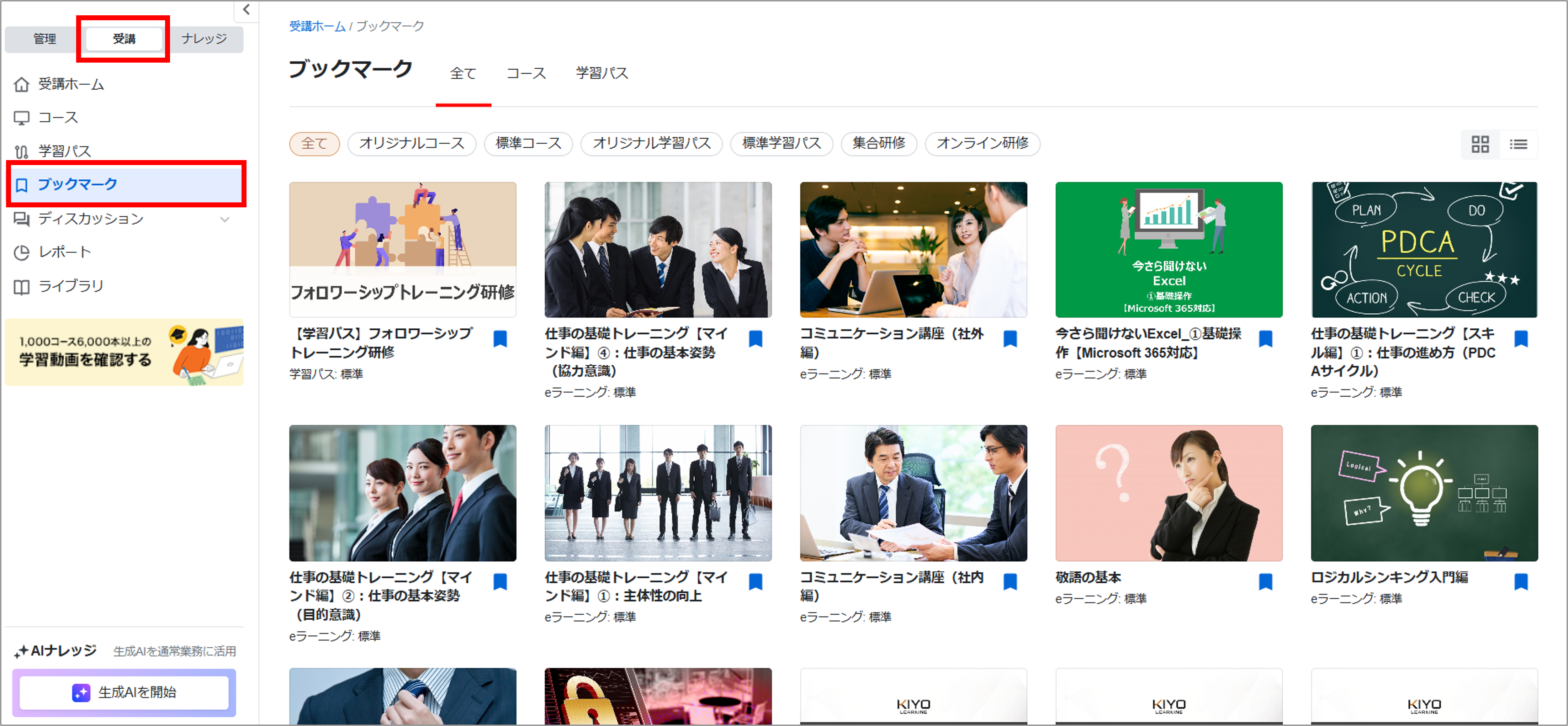 受講の指示をされたコースやライブラリ内の標準コースはブックマークをすることができます。