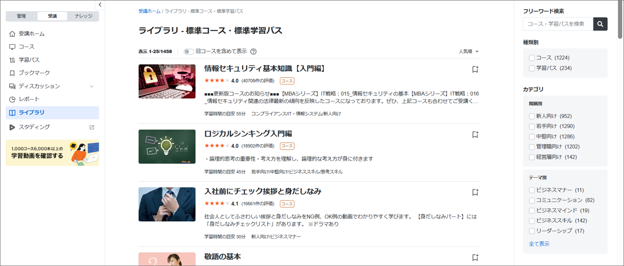 次に、左メニューのライブラリをクリックすると、標準コースの一覧が表示されます。