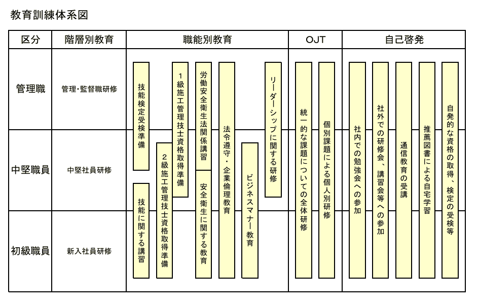 階層別研修をより体系的に運用するためには、研修体系図を作成することが効果的です。この体系図を用いることで、研修の全体像を視覚的に把握でき、実施すべき内容が明確になります。