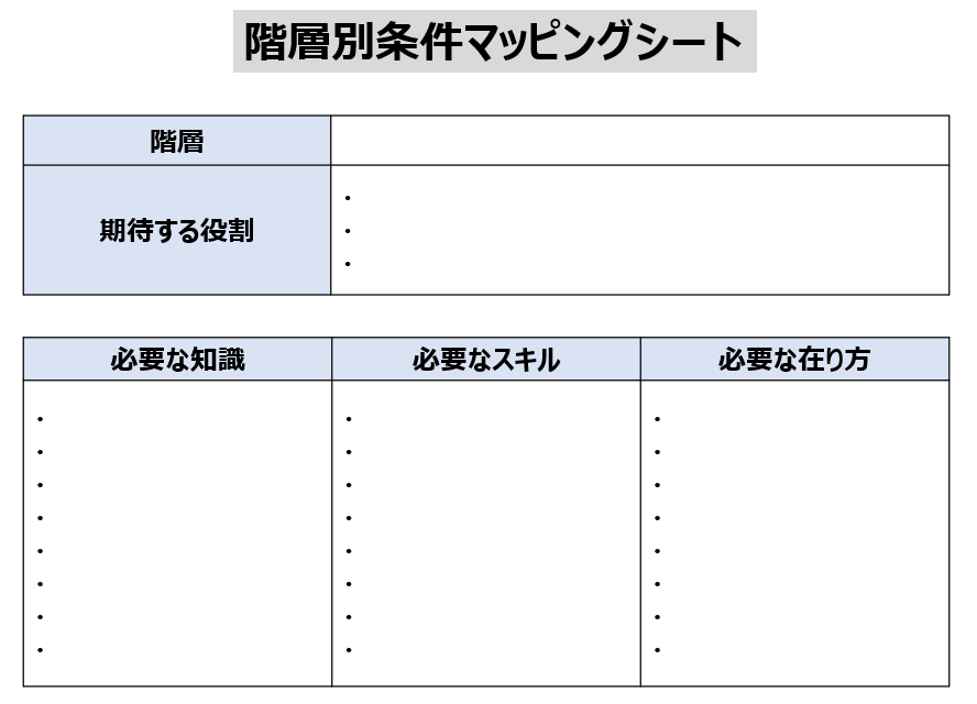- どのような知識が必要か:業界知識、専門スキル、最新技術など、階層ごとに業務を遂行するための具体的な知識を設定