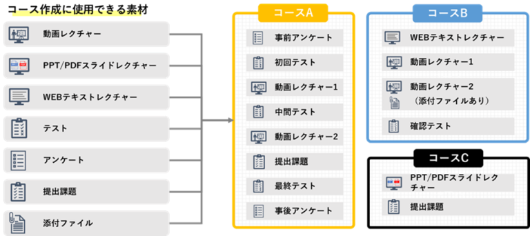 ▼動画・PowerPoint・PDF・テストなどを組み合わせて、自社オリジナルコースを作成するイメージ