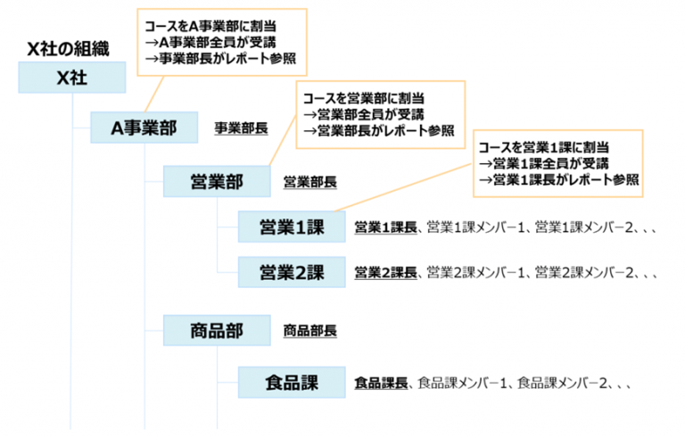 - コース割当:組織・階層・グループ単位での一括割当ができるか