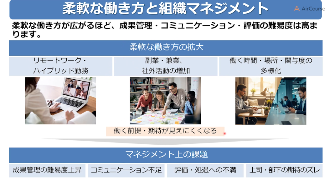 ・柔軟な働き方によって心理的契約のズレが生じる構造を理解する ・3つの評価制度を理解し、それぞれの特徴や本質を説明できるようになる ・事例を通じて、多様な働き方や評価制度によるマネジメントのポイントを考えられるようになる
