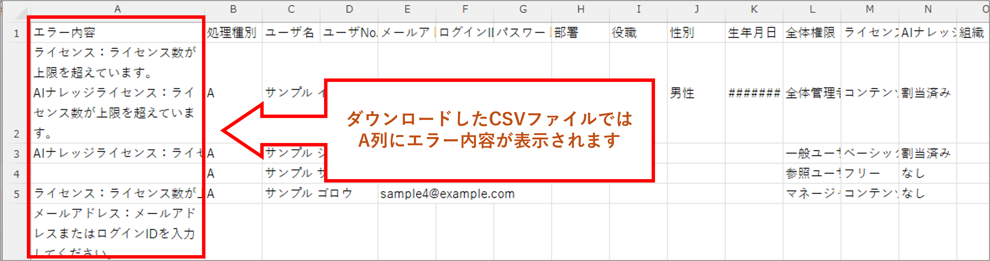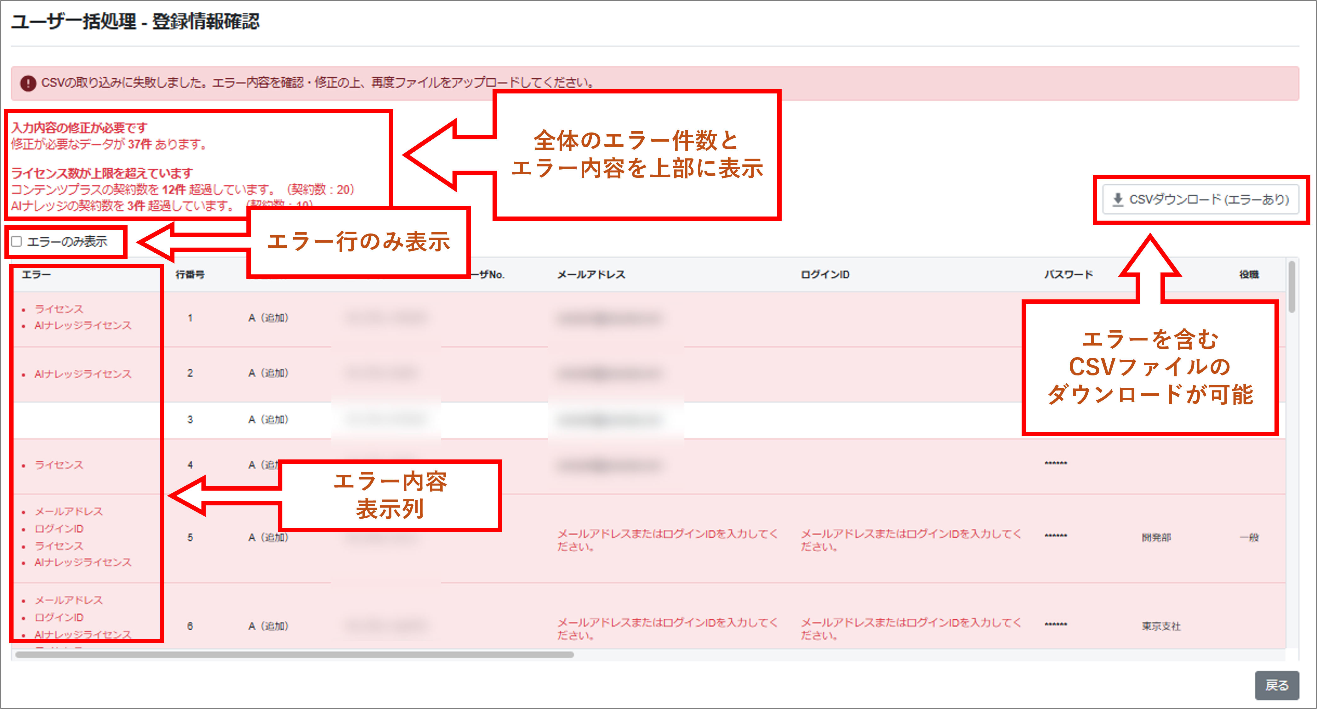 管理モード>ユーザ>「一括処理」でCSVアップロードによる情報の登録・変更・削除を行う際、不備の項目がある場合「エラーのみ表示」にチェックを入れることで、エラーがある行のみを表示できます。